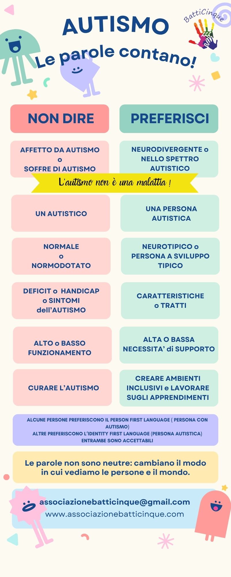 Negli altri casi, Associazione BattiCinque sceglie di sostenere le preferenze della comunità autistica, quindi consiglia di utilizzare le seguenti espressioni: